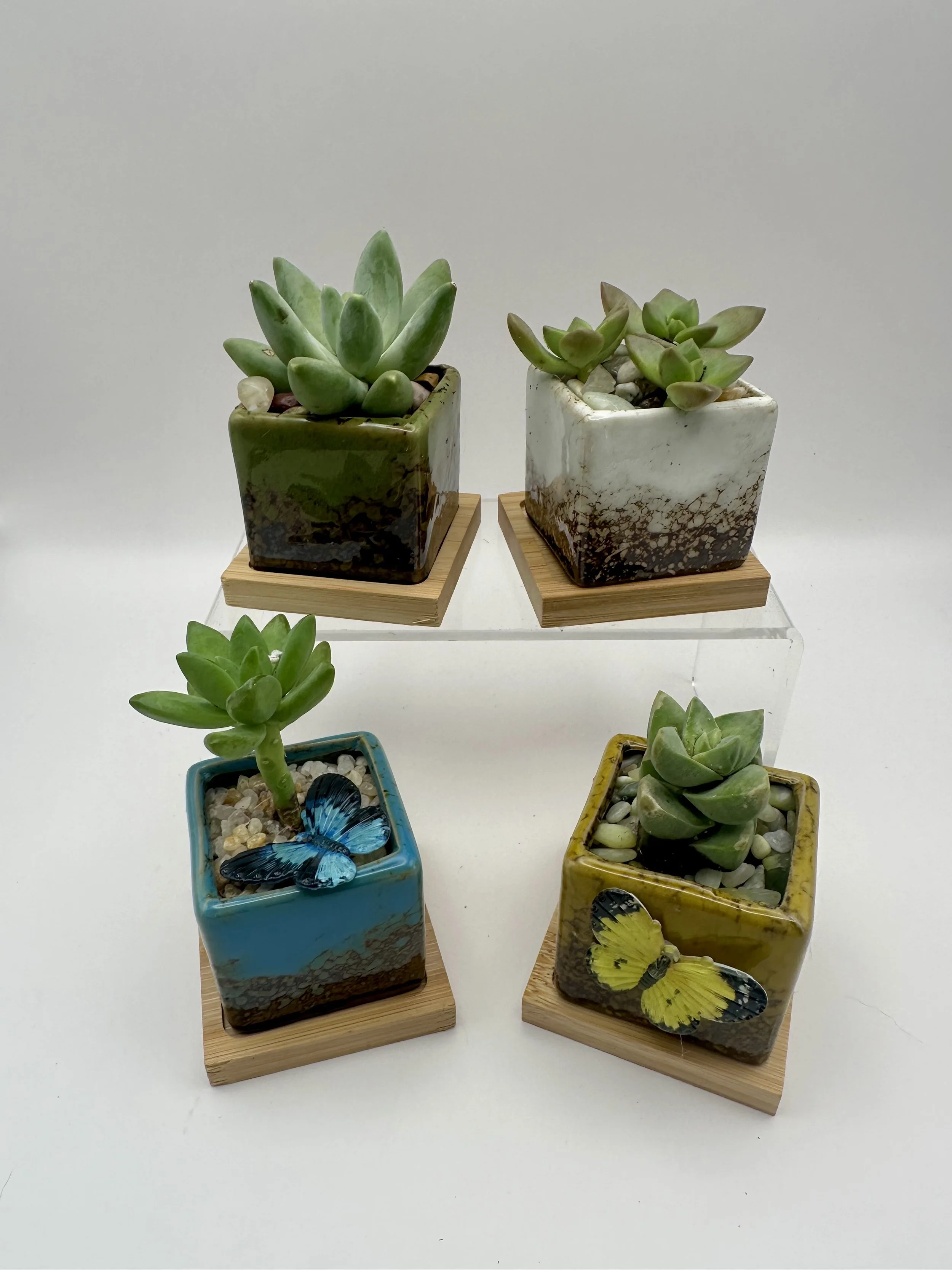 Four potted succulent plants in decorative ceramic pots, each placed on a small wooden base, arranged on a transparent acrylic stand against a plain background.