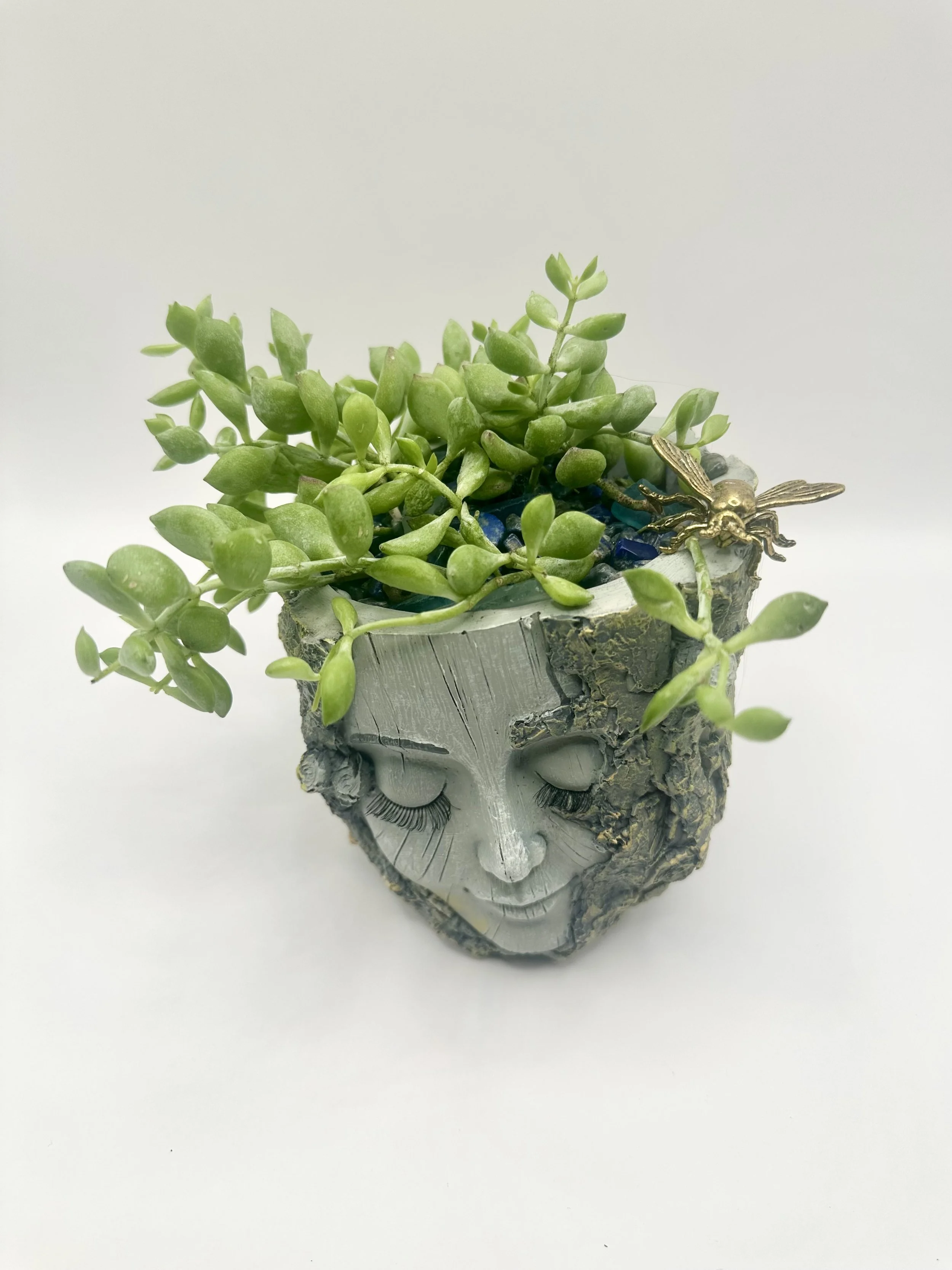 Sculptural female head planter with glass pieces instead of stones, topped with a brass fly. Modern, luminous, and refined.