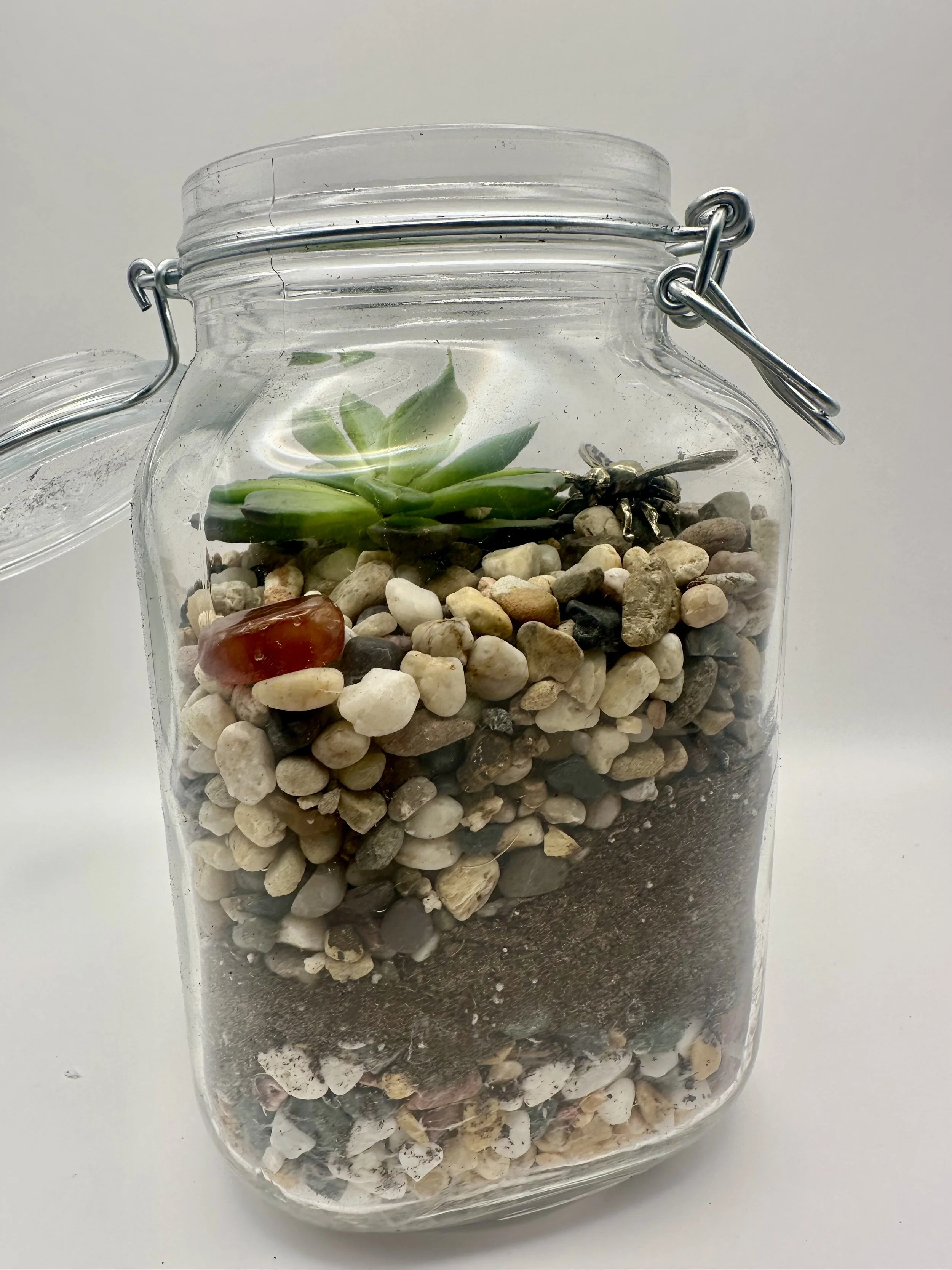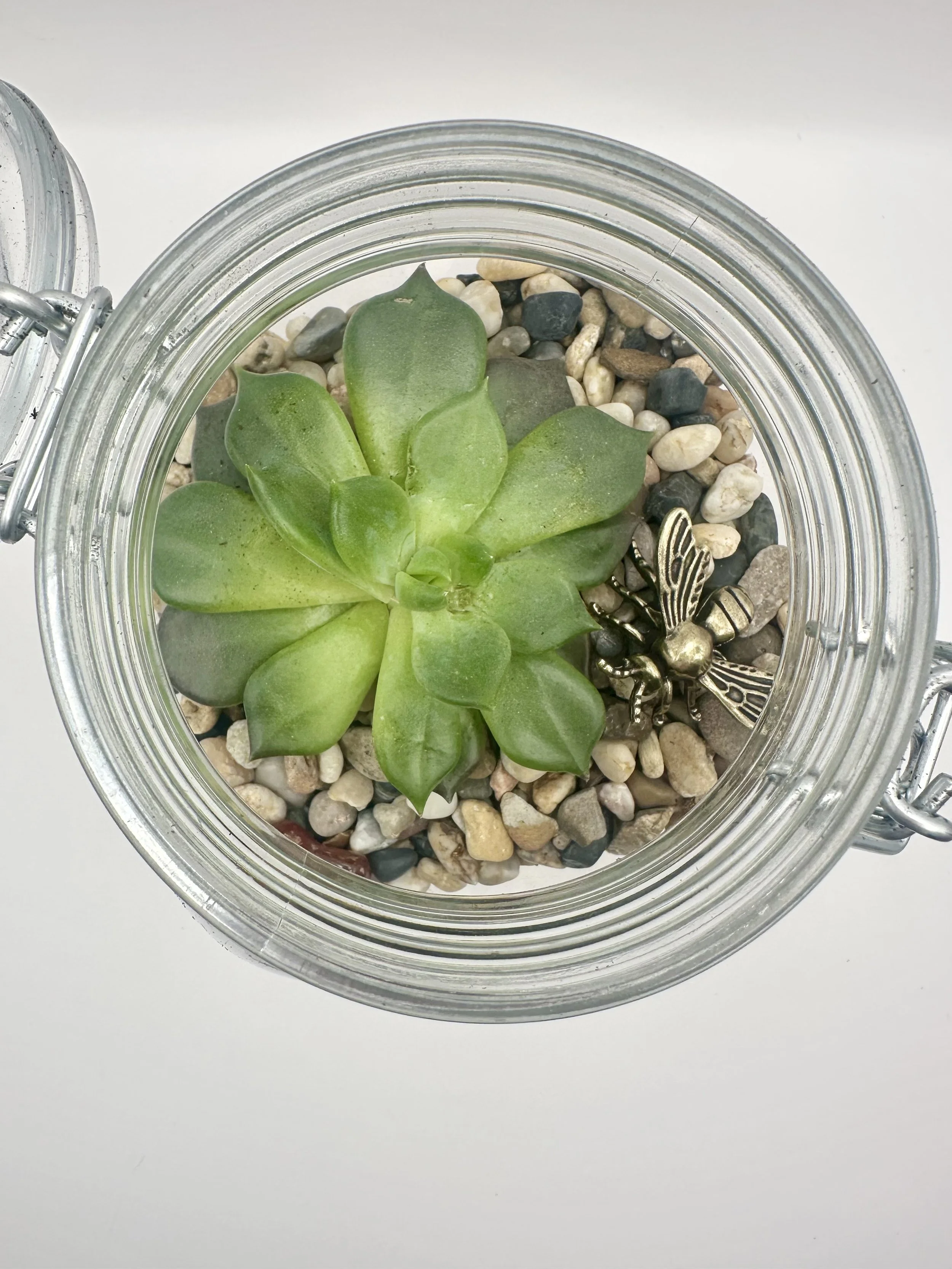 A glass terrarium captured from above — a layered landscape of stone, soil, and charcoal crowned with a thriving succulent and brass fly. Designed for longevity and light, it’s nature framed as art.