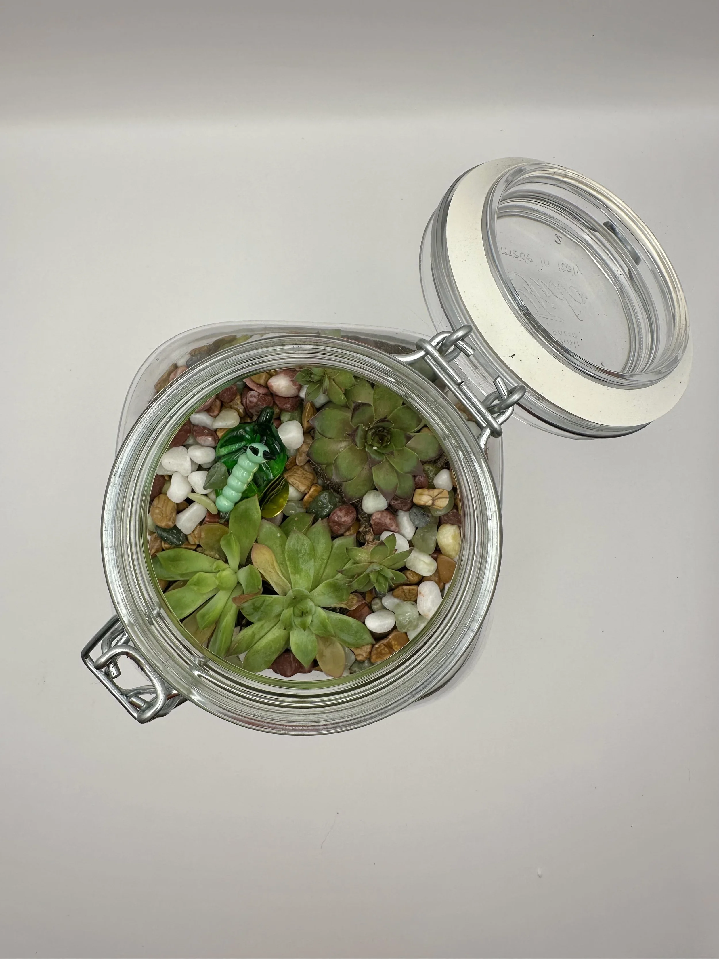 Layered glass terrarium with stones, soil, and charcoal for long-term growth. Features a glass leaf and small caterpillar accent — lively, intricate, and artful.