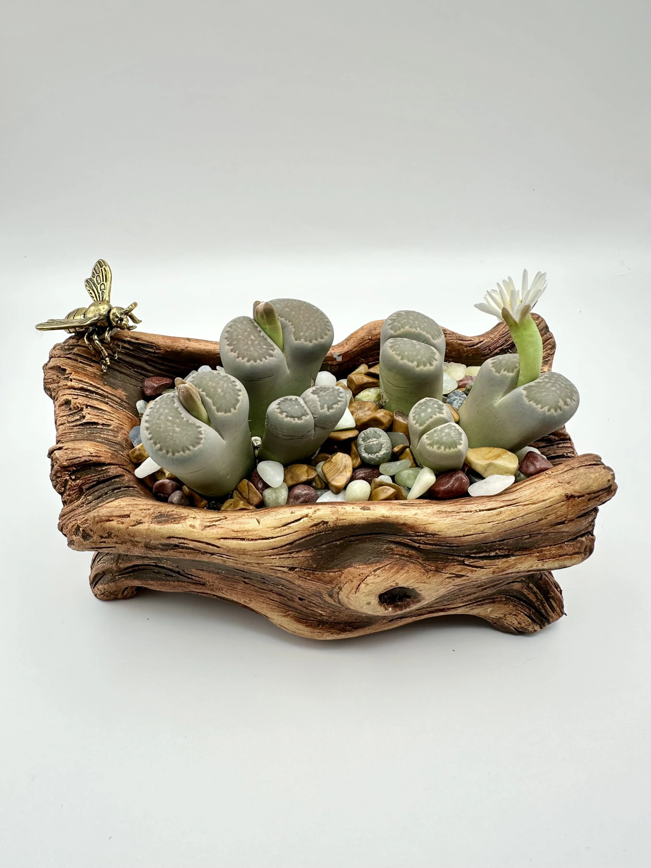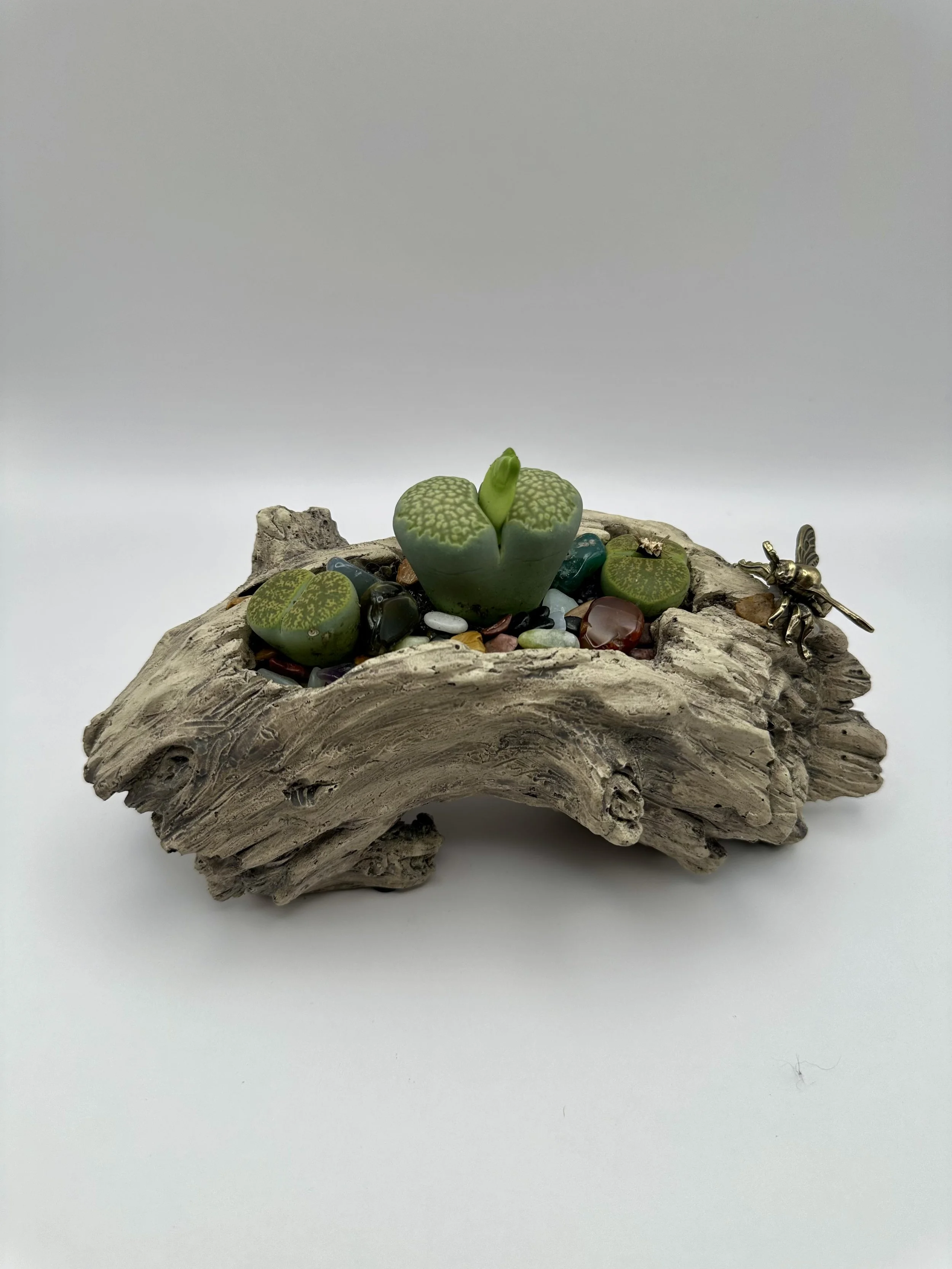 A ceramic driftwood-style planter featuring a rare lithops (“living stone”) and a single brass fly. Earthy, sculptural, and quietly surreal.