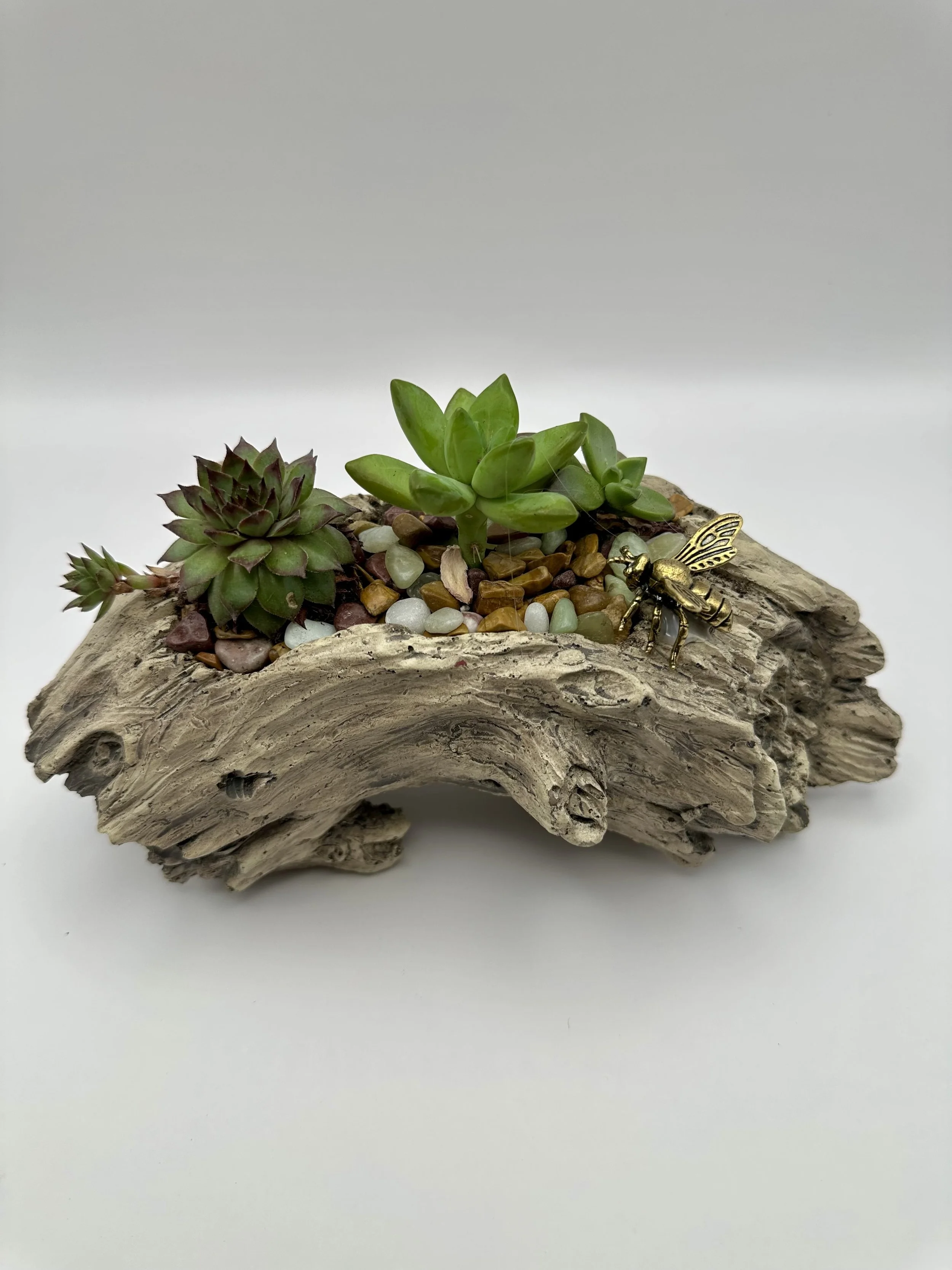 Resin driftwood planter with living succulent and brass fly accent — a perfect balance of natural texture and metallic detail.