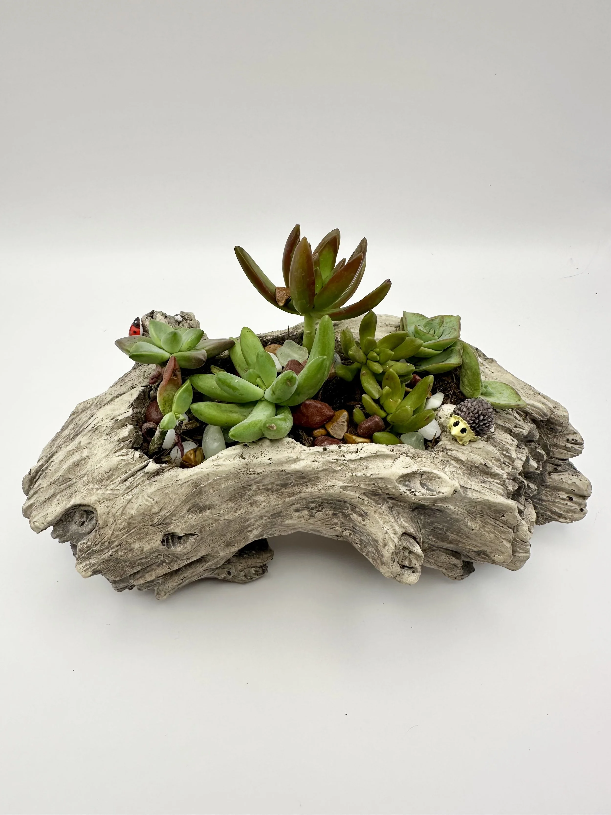 Resin driftwood planter filled with a lush mix of succulents — layered, organic, and designed to feel like a miniature landscape.
