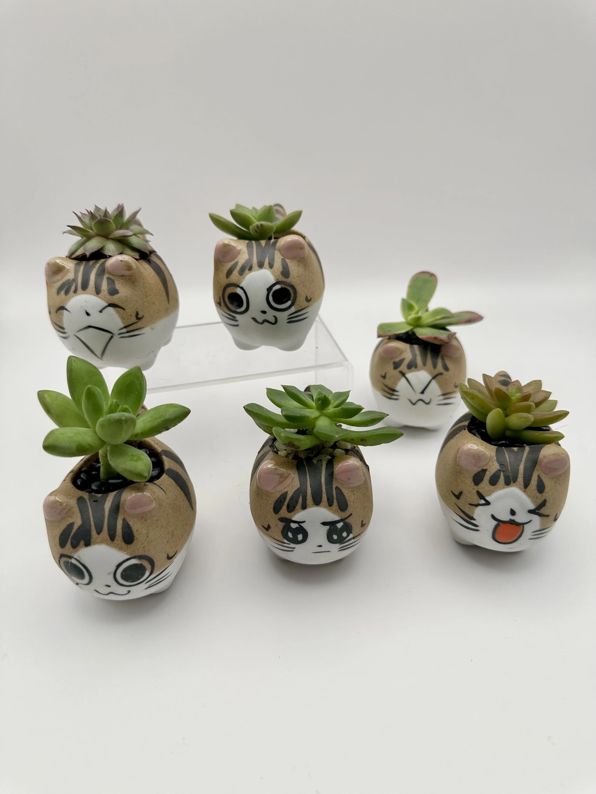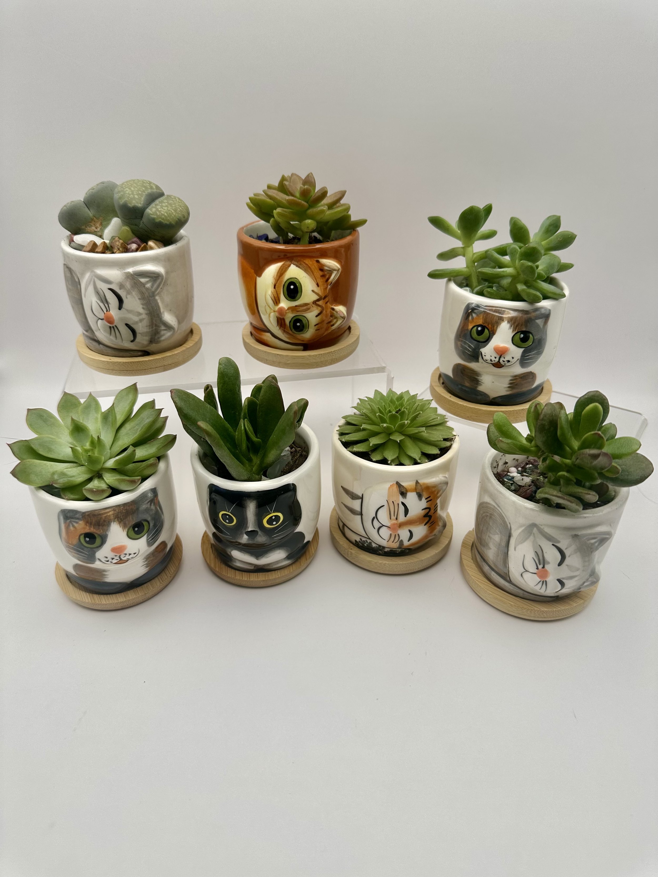 Round kitty pots — playful, hand-potted mini succulents featuring tuxedo, black, and ginger cat designs. Each planter includes sculpted porcelain details, decorative rocks, and lots of personality.