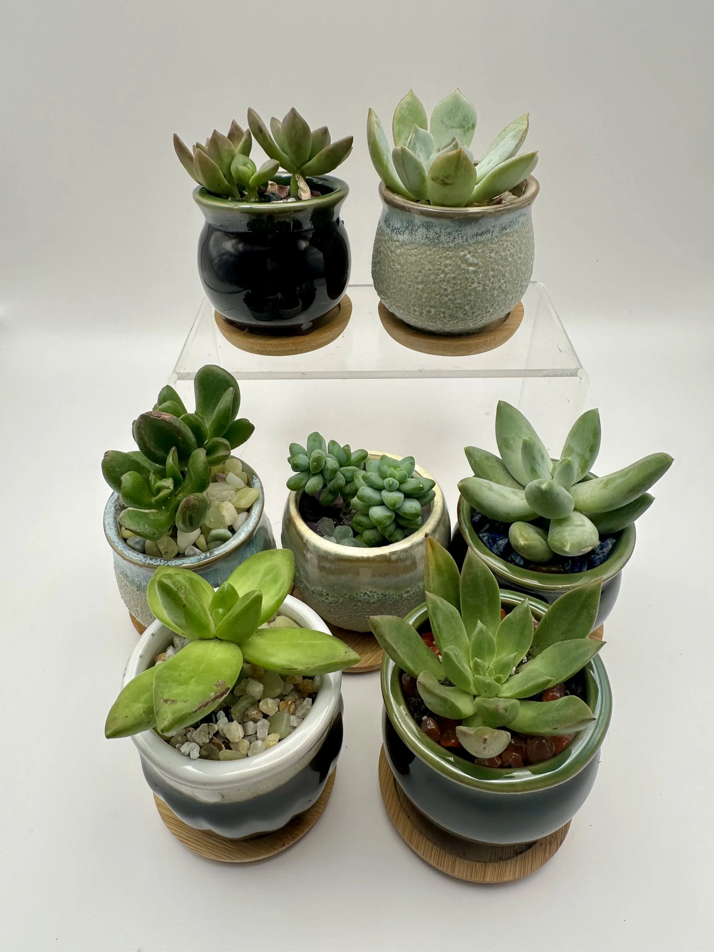 Collection of various potted succulents arranged on white surface, with some on wooden coasters and a clear stand.