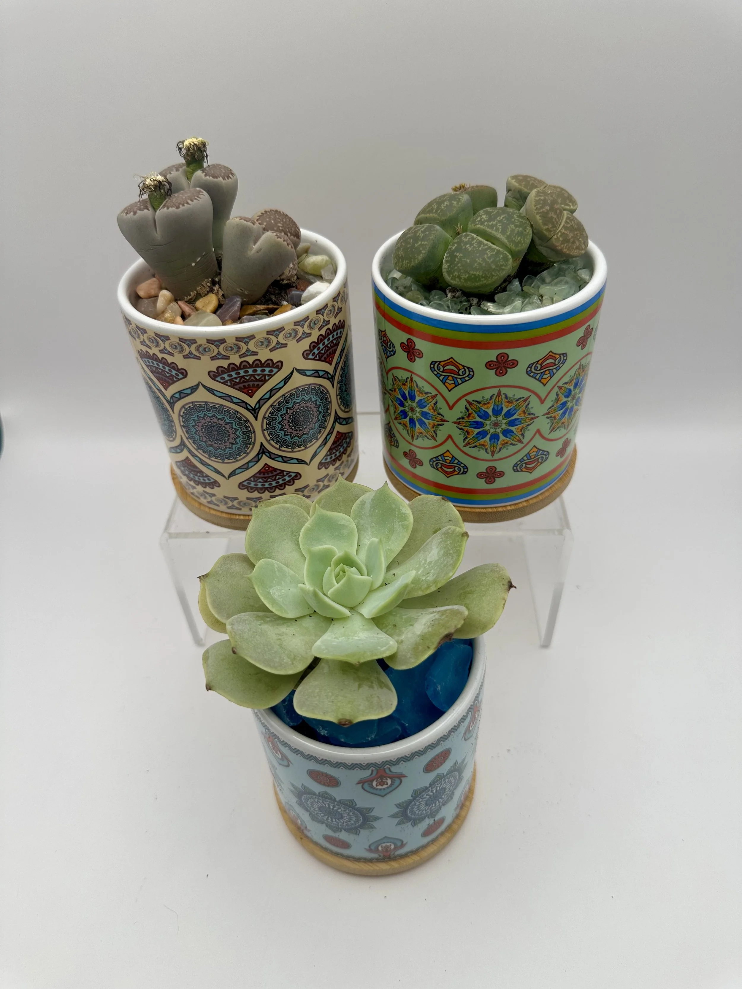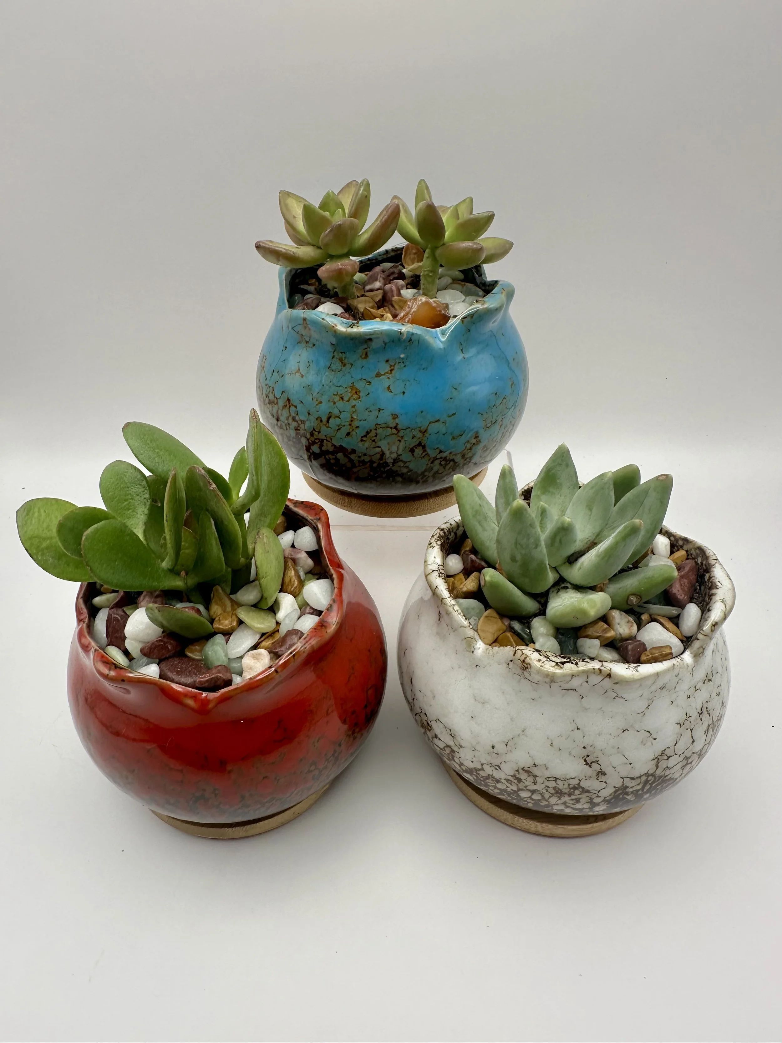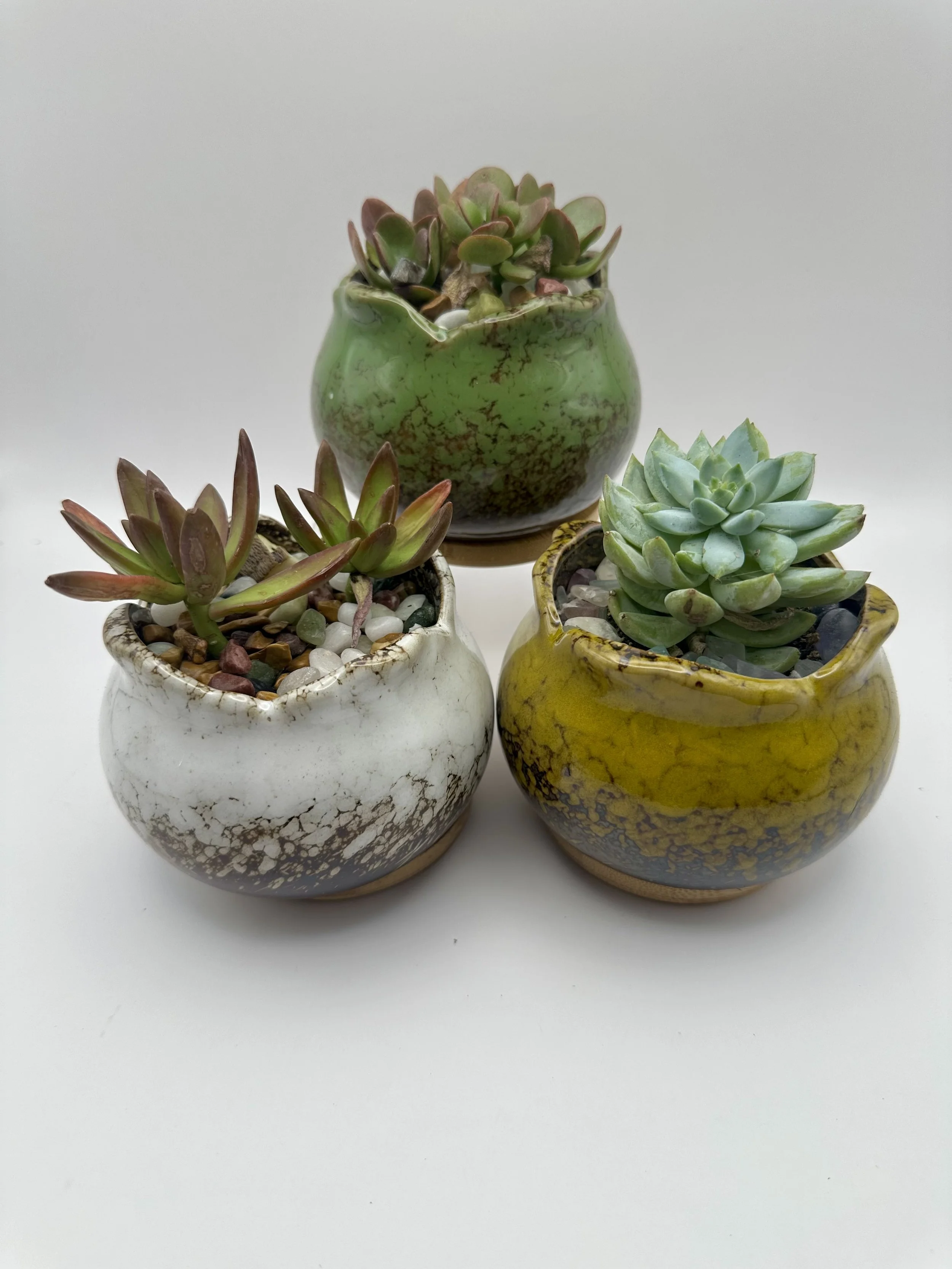 Three small potted succulent plants in colorful, textured ceramic pots with decorative stones.