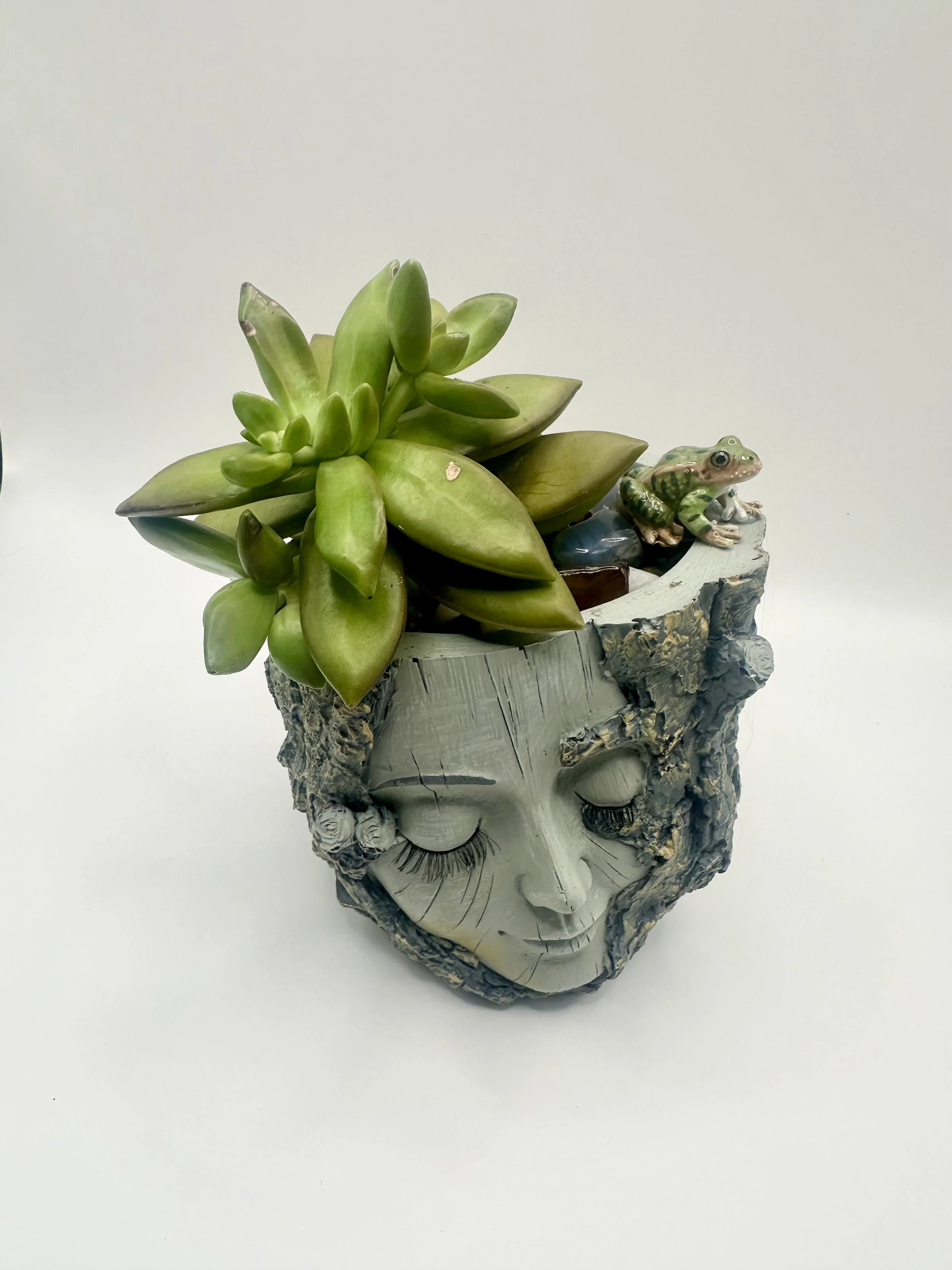 A sculptural woman’s head filled with a large, vibrant succulent and layered stones. Includes a charming $12 ceramic frog accent — elegant with a touch of playfulness.