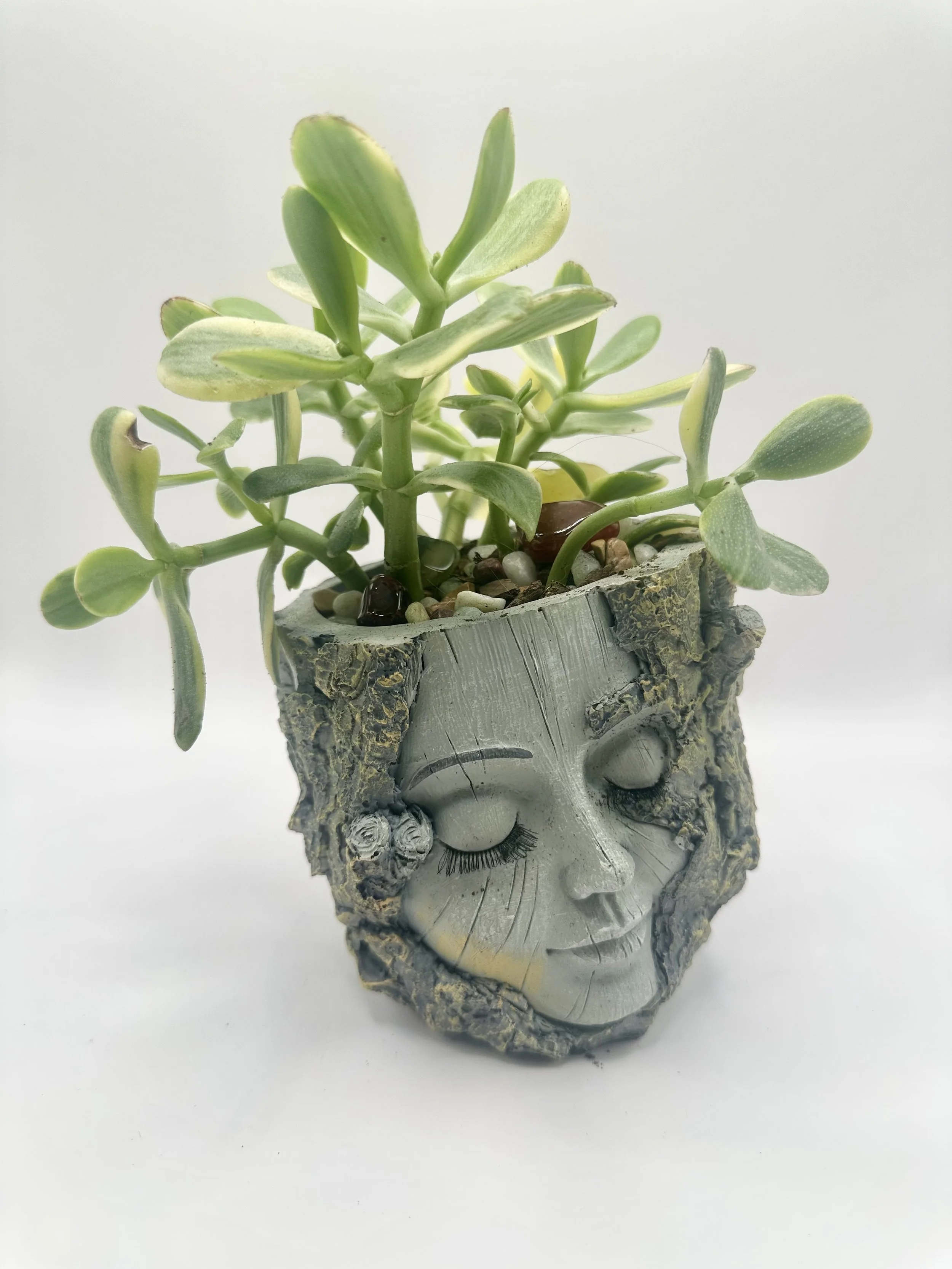 Some include symbolic or sculptural accents — like the lady-head planters, driftwood-style resin pieces, or glass terrariums.